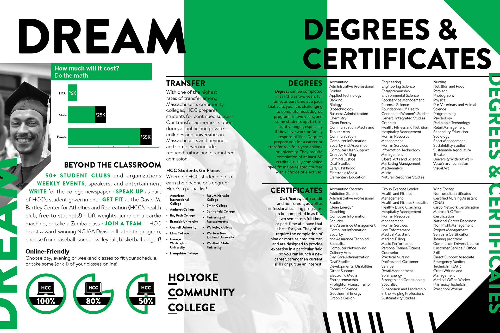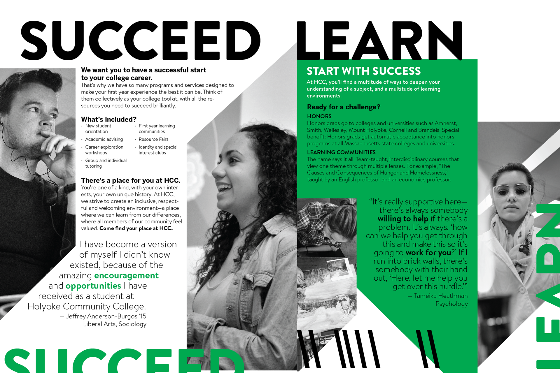 Two spreads advertising HCC's for-credit programs in their Professional Development & Personal Enrichment Bulletin. Designed for 2-color uncoated printing -- black and PMS 354.